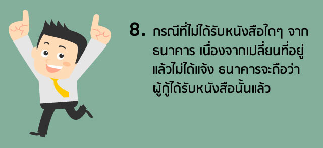 ในกรณีที่ไม่สามารถส่งหนังสือใดๆ ให้แก่ผู้กู้ได้เพราะสถานที่ดังกล่าวได้เปลี่ยนแปลงไป หรือถูกรื้อถอนโดยที่ผู้กู้ไม่ได้แจ้งการเปลี่ยนแปลงหรือรื้อถอนต่อธนาคารเป็นหนังสือหรือส่งให้ไม่ได้เพราะหาสถานที่ที่ระบุไว้ในสัญญาไม่พบ หรือไม่มีก็ดี ให้ถือว่าผู้กู้ได้รับหนังสือนั้นแล้วโดยชอบ
