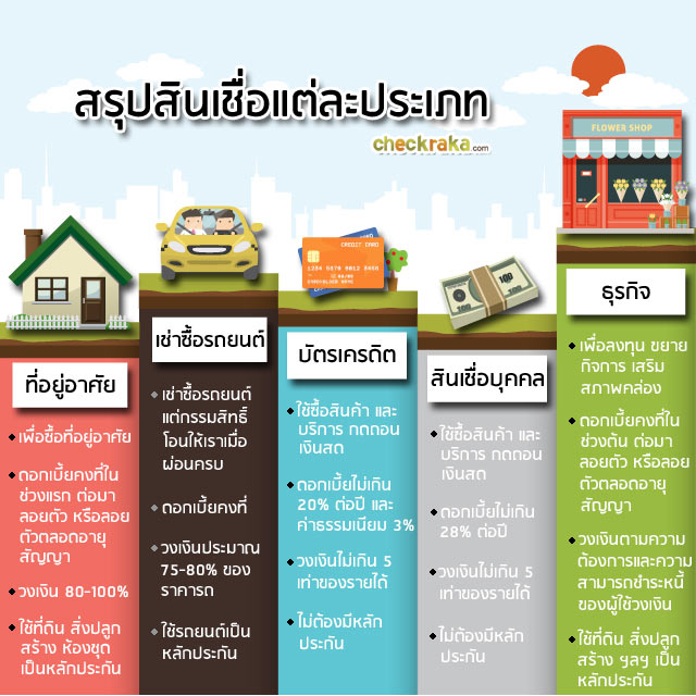 การทำความเข้าใจรายละเอียดของสินเชื่อแต่ละประเภท จะช่วยให้เรามีข้อมูลในการตัดสินใจ "เป็นหนี้" ได้อย่างเหมาะสม และรอบคอบยิ่งขึ้นด้วย ซึ่งปัจจุบันสถาบันการเงินต่างๆ มีบริการผลิตภัณฑ์สินเชื่อหลายรูปแบบเพื่อให้ตรงตามวัตถุประสงค์ และความต้องการของการใช้เงินของลูกค้า วันนี้ CheckRaka.com จะชวนเพื่อนๆ มาดูกันว่ามีรูปแบบอะไรกันบ้าง...