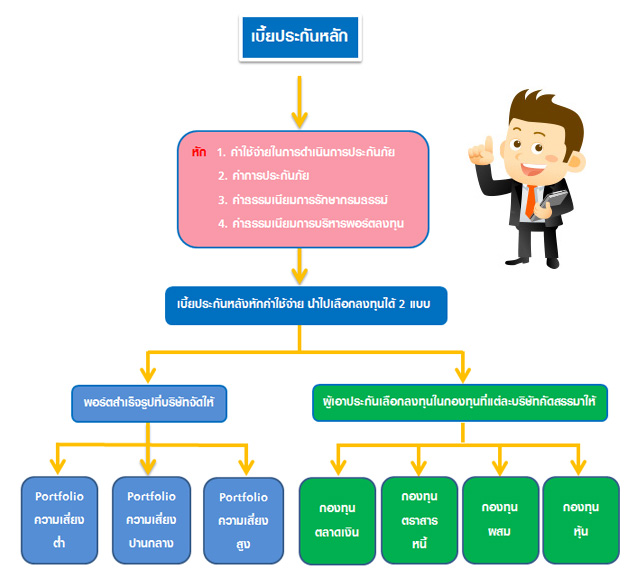 2. ส่วนของการลงทุน เกิดจากการนำเบี้ยประกันชีวิตส่วนที่เหลือหลังจากหักค่าประกันภัย และค่าใช้จ่ายอื่นๆ หรือที่เรียกว่า มูลค่าทางบัญชี ไปใช้ในการลงทุน โดยการซื้อหน่วยลงทุนรวมที่บริหารโดย บริษัทหลักทรัพย์จัดการกองทุน (บลจ.) ตามที่ผู้เอาประกัน หรือผู้ลงทุนเลือกไว้ ซึ่งจะไม่มีการรับประกันผลตอบแทนใดๆ ทั้งสิ้น