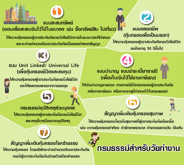 วัยทำงานเป็นวัยที่มีการเสียชีวิตมากที่สุด ไม่ว่าจะด้วยสาเหตุจากการเจ็บป่วยด้วยโรคร้าย อุบัติเหตุจากการขนส่ง หรืออุบัติเหตุจากการทำงาน ในแต่ละปีมีผู้บาดเจ็บ ทุพพลภาพ และตาย จากการทำงาน ทั้งในภาคอุตสาหกรรม และภาคเกษตรกรรมเพิ่มขึ้นอย่างต่อเนื่อง ผู้ที่อยู่ในวัยทำงานจึงควรดำเนินชีวิตอย่างระมัดระวัง วางแผนอนาคตสำหรับตนเองและครอบครัว ทั้งในด้านค่าใช้จ่ายในการรักษาพยาบาลเมื่อยามเจ็บป่วยหรือเกิดอุบัติเหตุ การออมเพื่อไว้ใช้จ่ายในวันข้างหน้าหรือในวัยเกษียณ การมีกรมธรรม์ประกันชีวิตไว้ในครอบครองเป็นการลดความเสี่ยงทางด้านการเงินเมื่อถึงเวลาที่จำเป็นต้องใช้จ่าย เราลองมาดูประเภทของกรมธรรม์ที่เหมาะสมสำหรับวัยทำงานกันค่ะ