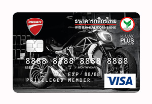 ![]() บัตรเดบิต K-Max Plus DUCATI | วงเงินสูงสุด 200,000 บาท | วงเงินสูงสุด 5,000 บาท/ครั้ง | วงเงินสูงสุด 300 บาท/วัน (สูงสุด 30 วัน) |