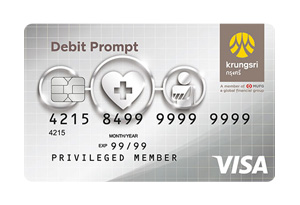 ![]() บัตรกรุงศรี เดบิต พร้อม | วงเงินสูงสุด 300,000 บาท | วงเงินสูงสุด 5,000 บาท/ครั้ง | ไม่มี |