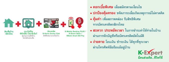สินเชื่อบ้านกสิกรไทยพร้อมประกันชีวิตพิทักษ์สิน และบัตรเครดิต K Home Smiles Club รับดอกเบี้ยบ้านอัตราดอกเบี้ยเงินกู้พิเศษ ของสมนาคุณ และสิทธิพิเศษมากมาย