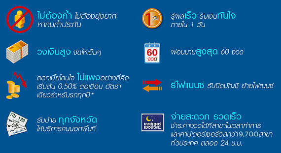 - เฉพาะรถเก๋ง กระบะ อายุรถไม่เกิน 10 ปี และยี่ห้อรถที่กำหนดเท่านั้น
