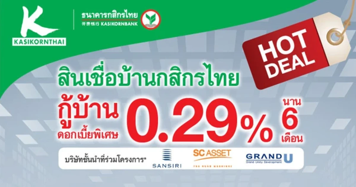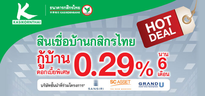 กู้สินเชื่อบ้านกับกสิกรไทย รับดอกเบี้ยพิเศษ 0.29% ต่อปี นาน 6 เดือน โดยมีบริษัทที่ร่วมโครงการ คือ SANSIRI, SC ASSET และ GRAND U พร้อมรับฟรี...ของสมนาคุณ 2 ต่อ