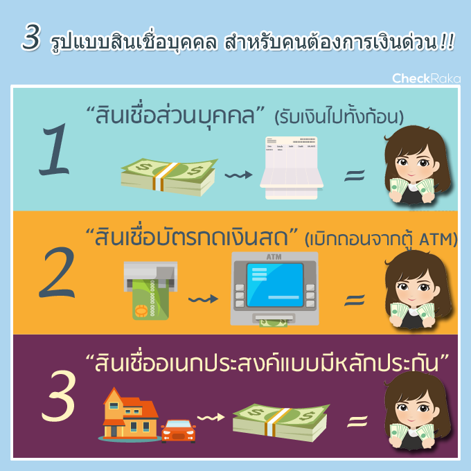 แหล่งเงินกู้ที่สามารถนำมาใช้ยามฉุกเฉิน ปัจจุบันก็มีอยู่มากมายหลายแหล่ง ไม่ว่าจะเป็นการกู้เงินจากสถาบันการเงินต่างๆ เช่น ธนาคาร หรือบริษัทไฟแนนซ์ ต่างก็มีผลิตภัณฑ์เงินกู้ฉุกเฉินออกมาบริการให้กับลูกค้าที่มีความจำเป็นใช้เงินทุกคน แต่สิ่งที่ต้องบอกและย้ำกันอยู่เสมอในทุกๆ การกู้เงินนั้น แหล่งเงินกู้ที่เราไม่ควรข้องเกี่ยวนั่นก็คือ "เงินกู้นอกระบบ" เพราะนอกจากจะทำให้เราต้องจ่ายดอกเบี้ยในจำนวนที่มากสุด โหดสุดแล้ว อาจจะทำให้เรามีปัญหาทางการเงินวนเวียนแบบไม่รู้จบก็เป็นได้ ดังนั้น วันนี้ CheckRaka.com จะขอนำเสนอทางเลือกในการกู้เงินฉุกเฉินยามจำเป็น ที่ได้รับดอกเบี้ยในอัตราต่ำ สามารถผ่อนชำระได้ในระยะยาว เบิกถอนง่าย อนุมัติเร็ว และตอบโจทย์ทุกการใช้เงิน