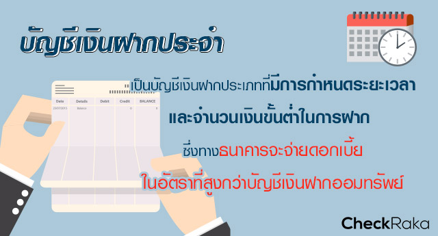 สำหรับบัญชีเงินฝากประจำเป็นบัญชีเงินฝากประเภทที่มีการกำหนดระยะเวลา และจำนวนเงินขั้นต่ำในการฝาก ซึ่งทางธนาคารจะจ่ายดอกเบี้ยในอัตราที่สูงกว่าบัญชีเงินฝากออมทรัพย์ เพราะการฝากเงินในบัญชีเงินฝากประจำจะมีระยะเวลาในการฝากที่นานกว่า ซึ่งภายในระยะเวลาที่กำหนดไว้เราจะไม่สามารถถอนเงินออกมาได้ ดังนั้นบัญชีประเภทนี้จะให้ดอกเบี้ยในอัตราที่สูงกว่าบัญชีเงินฝากออมทรัพย์ เหมาะสำหรับคนที่ไม่มีเหตุต้องใช้เงิน สามารถเก็บเงินฝากไว้เย็นๆ กับทางธนาคารได้ ก็ควรเปิดบัญชีประเภทนี้เพื่อฝากเงินระยะยาวแลกกับอัตราดอกเบี้ยที่สูงกว่า