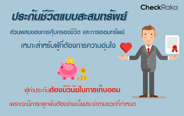การประกันชีวิตแบบสะสมทรัพย์ จึงเป็นส่วนผสมของการคุ้มครองชีวิต และการออมทรัพย์ โดยส่วนของการออมทรัพย์ คือส่วนที่ผู้เอาประกันได้รับคืนเมื่อสัญญาครบกำหนด ซึ่งเงินที่เราส่งประกันไปในทุกๆ เดือน หรือทุกๆ ปี จะเรียกว่า "เบี้ยประกัน" หากเรายกเลิกก่อนจะครบสัญญา โดยเฉพาะอย่างยิ่ง ถ้าเรายกเลิกในปีแรกของการทำประกันชีวิต ผู้เอาประกันจะไม่ได้รับเงินคืน ซึ่งรูปแบบการทำประกันชีวิตสะสมทรัพย์จะมีทั้งแบบระยะสั้น ระยะกลาง และระยะยาว ตั้งแต่ 3 - 5 ปี ไปจนถึง 25 - 30 ปี
