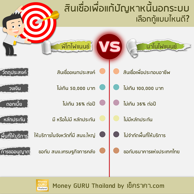 ก่อนที่สินเชื่อ "พิโกไฟแนนซ์" Pico Finance จะมีการเริ่มใช้ ทางรัฐบาลก็ได้ส่งสินเชื่อ "นาโนไฟแนนซ์" Nano Finance มาช่วยเหลือผู้ประกอบอาชีพที่มีปัญหาการกู้เงินจากเงินกู้นอกระบบ ทำให้พ่อค้า แม่ค้า หลายคนไม่ต้องทนอยู่กับดอกเบี้ยโหดอีก ดังนั้น เรามาดูกันค่ะว่า เราจะเลือกกู้แบบไหนดี แบบไหนเหมาะ ในกรณีที่จำเป็นจะต้องกู้เงินแบบฉุกเฉิน