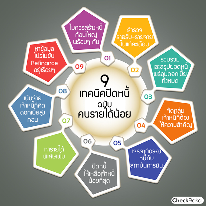 จากสภาพเศรษฐกิจในปัจจุบันทำให้หลายคนมีปัญหาเรื่องการเงิน โดยเฉพาะการ "ชำระหนี้" เกิดภาวะชักหน้าไม่ถึงหลัง เงินเดือนที่ได้มาก็ใช้แบบเดือนชนเดือนจนทำให้หนี้ที่มีอยู่กลายเป็นดินพอกหางหมู ชำระคืนยังไงก็ไม่หมดสักที ดังนั้น ใคร...ที่กำลังตกอยู่ในสถานการณ์เงินไม่พอใช้หนี้ ไม่มีทางออกหรือไม่รู้จะแก้ปัญหาเรื่องนี้ยังไง!! วันนี้ CheckRaka.com มี 9 เทคนิคปิดหนี้ฉบับคนรายได้น้อย ที่ใครๆ ก็ทำได้ มาฝากเพื่อนๆ ที่กำลังเจอปัญหานี้อยู่ค่ะ เริ่มจากตั้งสติและทำตามเทคนิคดังนี้ค่ะ