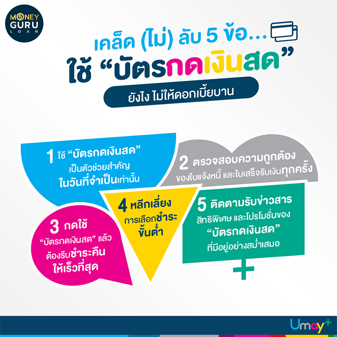 ข้อที่ 1 >> ใช้ "บัตรกดเงินสด" เป็นตัวช่วยสำคัญในวันที่จำเป็นเท่านั้น : เพราะหนี้จากบัตรกดเงินสดนั้นจะเกิดขึ้นก็ต่อเมื่อเรากดถอนเงินสดออกมาใช้ ใช้เท่าไหร่เสียพร้อมดอกเบี้ยเท่านั้น...ไม่ใช้ก็ไม่เสีย!