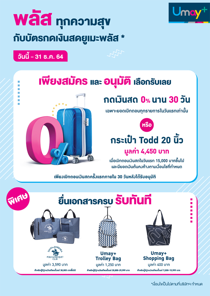 จากรายละเอียดทั้งหมดของบัตรกดเงินสดยูเมะพลัส ที่ทางทีมงาน CheckRaka นำมาให้ดูนี้ จะเห็นได้ว่าจุดเด่นของบัตรกดเงินสดใบนี้ จะเด่นในเรื่องของสิทธิประโยชน์ที่ไม่เหมือนกับสถาบันการเงินอื่น นอกเหนือจากนี้ก็เป็นในส่วนของโปรโมชั่นบัตรกดเงินสดยูเมะพลัสที่มีออกมาให้ได้ WoW กันอย่างสม่ำเสมอตลอดทั้งปี ซึ่งถ้าสมัครในช่วงต้นปีแบบนี้ (วันนี้ - 31 ธ.ค. 64) เมื่อได้รับอนุมัติพร้อมเบิกถอนเงินครั้งแรกภายใน 30 วัน จะเลือกรับดอกเบี้ย 0% นาน 30 วัน หรือจะเลือกกระเป๋าเดินทางล้อลาก Todd ขนาด 20 นิ้ว มูลค่า 4,450 บาท
