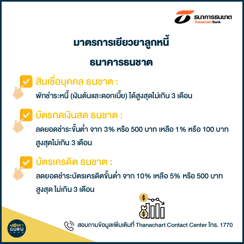 - สินเชื่อบุคคล ธนชาต : มาตรการความช่วยเหลือ สำหรับลูกค้า ผลิตภัณฑ์ Welfare / Pilot Loan/ Scholar Loan/ Smart benefit/ บำเหน็จค้ำประกัน พักชำระหนี้ (เงินต้นและดอกเบี้ย) ได้สูงสุดไม่เกิน 3 เดือน และเมื่อครบกำหนดให้กลับมาชำระหนี้ตามปกติ