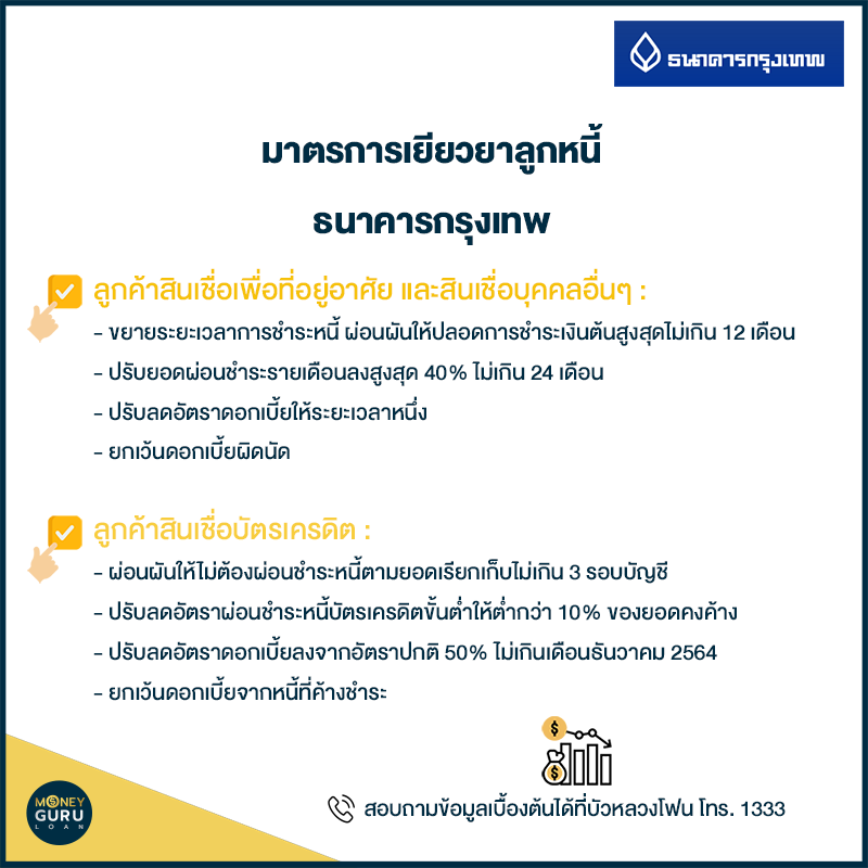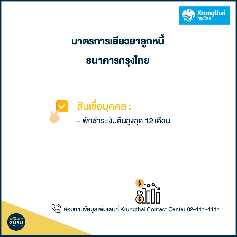 ติดต่อขอรับความช่วยเหลือได้ทุกสาขาและสำนักงานธุรกิจทั่วประเทศ ตั้งแต่วันนี้เป็นต้นไป สอบถามข้อมูลเพิ่มเติมที่ Krungthai Contact Center 02-111-1111
