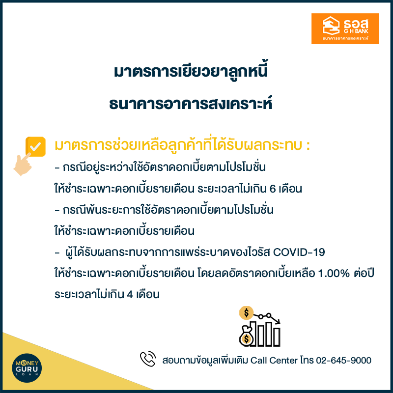 ธอส. ประกาศมาตรการช่วยเหลือลูกค้า ทีได้รับผลกระทบทางเศรษฐกิจ และ COVID-19 ให้ชำระเฉพาะดอกเบี้ย กรอบวงเงินสินเชื่อลูกค้าธนาคาร 20,000 ล้านบาท โดยแสดงหลักฐานหรือเอกสาร หรือข้อมูลอื่นที่เชื่อมโยงผลกระทบที่เกิดขึ้นได้ ซึ่งครอบคลุมทั้งลูกค้าที่ยังมีสถานะปกติ และลูกค้าที่มีสถานะเป็นหนี้ที่ไม่ก่อให้เกิดรายได้หรือ NPL แบ่งเป็น 3 กรณี ประกอบด้วย