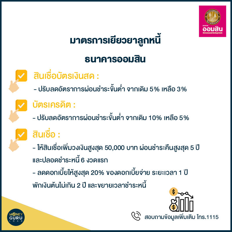 ธนาคารออมสิน ออกมาตรการช่วยเหลือลูกค้าที่ได้รับผลกระทบจากภาวะเศรษฐกิจและวิกฤตไวรัส COVID-19 ช่วยให้คุณผ่อนหนักเป็นเบา กับมาตรการช่วยเหลือผู้ถือบัตรเครดิต และสินเชื่อบัตรเงินสด (ลูกค้าที่ยังไม่เป็นหนี้ค้างชำระเกิน 90 วัน) โดยมีรายละเอียด ดังนี้