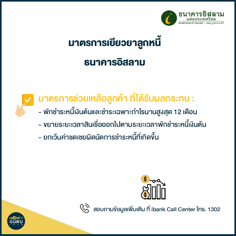 ธนาคารอิสลามแห่งประเทศไทย (ไอแบงก์) ออกมาตรการให้ความช่วยเหลือลูกค้าที่ได้รับผลกระทบจากภาวะเศรษฐกิจชะลอตัว จากสถานการณ์ต่างๆ ที่เกิดขึ้นสะสมต่อเนื่อง เช่น สงครามการค้า ภาวะภัยแล้ง รวมไปถึงการแพร่ระบาดของโควิด-19 เพื่อแบ่งเบาภาระให้ลูกค้า โดยมีรายละเอียด ดังนี้