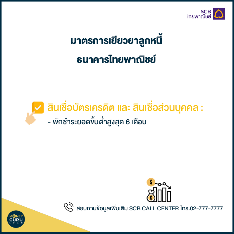 - สินเชื่อบัตรเครดิตและสินเชื่อส่วนบุคคล : พักชำระยอดขั้นต่ำสูงสุด 6 เดือน