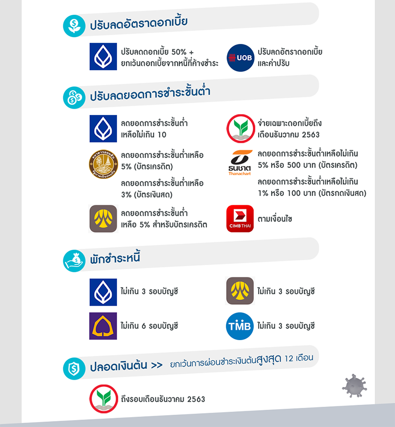 - ธนาคารขยายระยะเวลาการชำระหนี้ ผ่อนผันให้ปลอดการชำระเงินต้นสูงสุดไม่เกิน 12 เดือน