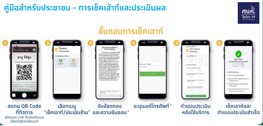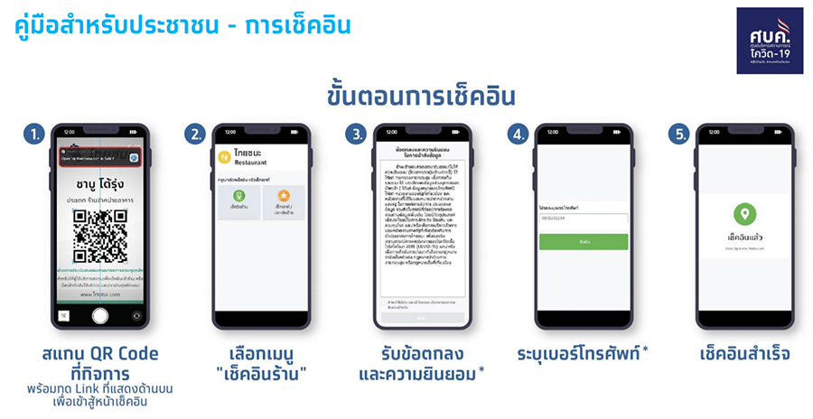 แพลตฟอร์ม "ไทยชนะ" ใช้เพื่อ Check In - Check Out ก่อนเข้าและหลังใช้บริการ โดยมีขั้นตอน ดังนี้