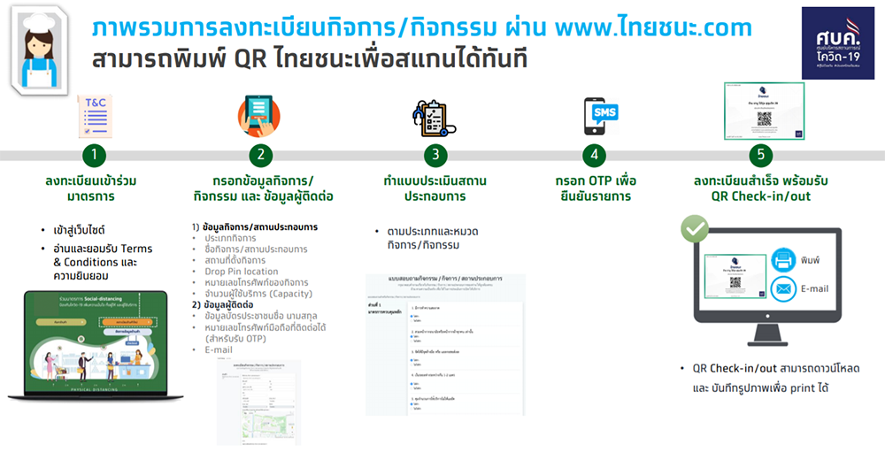 แพลตฟอร์ม "ไทยชนะ" ใช้เพื่อ Check In - Check Out ก่อนเข้าและหลังใช้บริการ โดยมีขั้นตอน ดังนี้