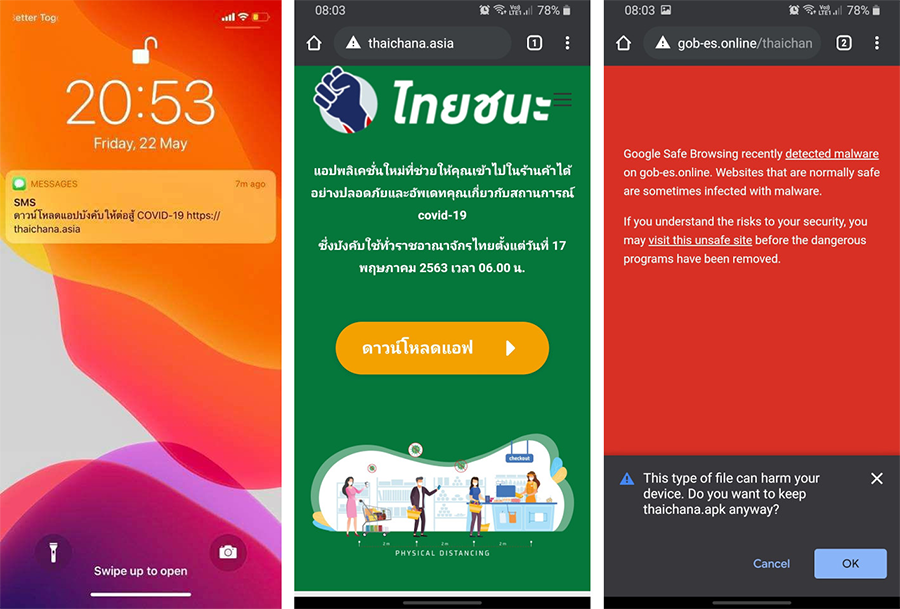 จากเหตุการณ์ที่เกิดขึ้นพบว่ามีการแพร่กระจายมัลแวร์ โจมตีผู้ใช้งาน Android ในประเทศไทย โดยช่องทางการส่ง SMS ที่แอบอ้างว่าเป็นการดาวน์โหลดแอปพลิเคชัน "ไทยชนะ" ใน SMS ดังกล่าวนั้นจะมีการลิงก์ไปยังเว็บไซต์ หลอกลวง เช่น