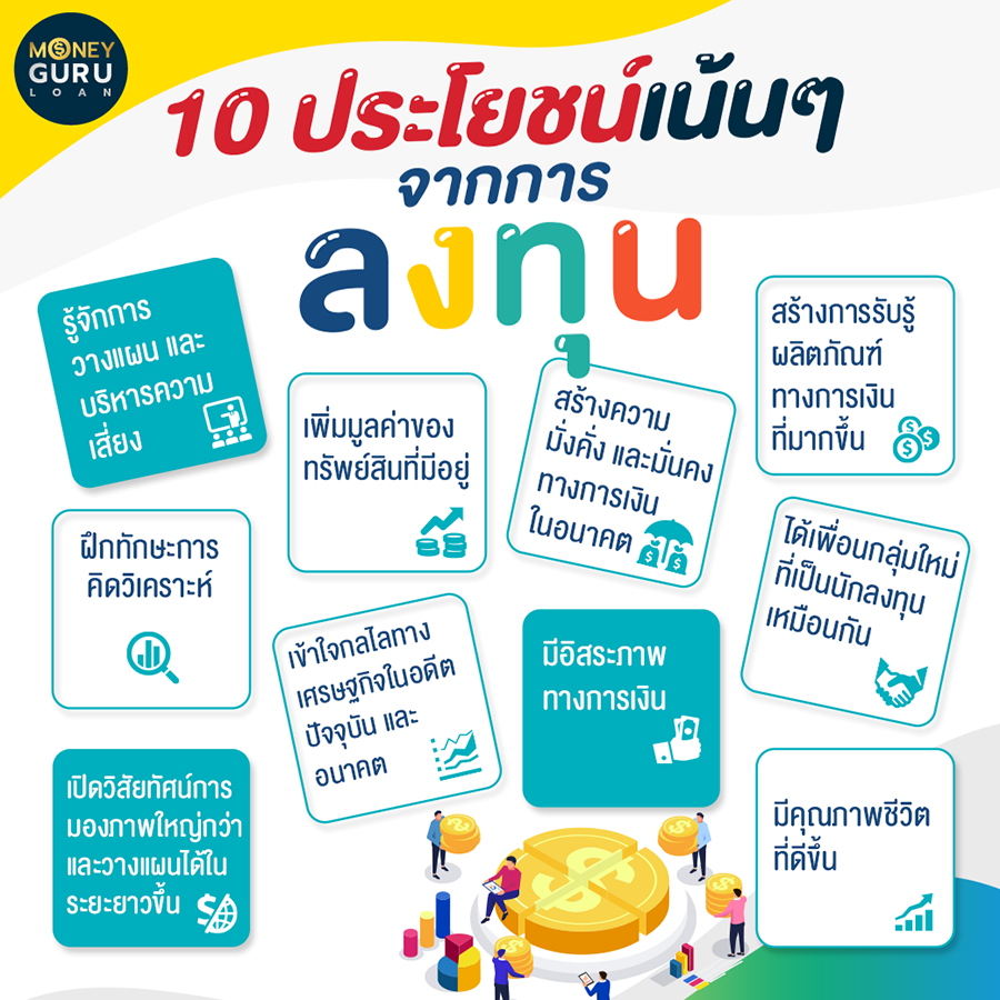 ทำไม...ต้องลงทุน?การลงทุน (Investment) คือ การออมในแบบที่ทำเพื่อให้ได้รับผลตอบแทนกลับมามากขึ้นในอนาคต แต่ทุกการลงทุนนั้นนักลงทุนจะต้องทำความเข้าใจด้วยว่า "การลงทุนมีความเสี่ยง" ซึ่งอาจจะมีผลทำให้ผู้ลงทุนได้รับเป็นกำไรหรือขาดทุนก็ได้ ทั้งนี้ขึ้นอยู่กับการตั้งเป้าหมาย การตัดสินใจ การวางแผน และการศึกษาหาข้อมูลที่เกี่ยวข้องกับการลงทุนนั้นๆ ให้ดี เพื่อเป็นการลดความเสี่ยงการขาดทุนจากการลงทุน และได้รับผลตอบแทนตามที่เราตั้งเป้าหมายไว้