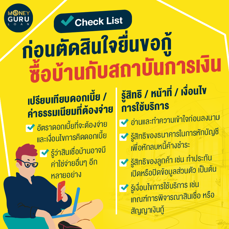 "Check List" ก่อนตัดสินใจยื่นขอกู้ซื้อบ้านกับสถาบันการเงินCheck List เป็นสิ่งจำเป็นที่ต้องทำก่อนตัดสินใจจะซื้อบ้านสักหลัง เพื่อเป็นแนวทางให้เราเตรียมความพร้อมได้ล่วงหน้า ไม่พลาด ด้วยการทำเรื่องยากให้เป็นเรื่องง่าย เมื่อยื่นกู้ซื้อบ้านกับธนาคารแล้วได้รับการอนุมัติแบบผ่านฉลุย