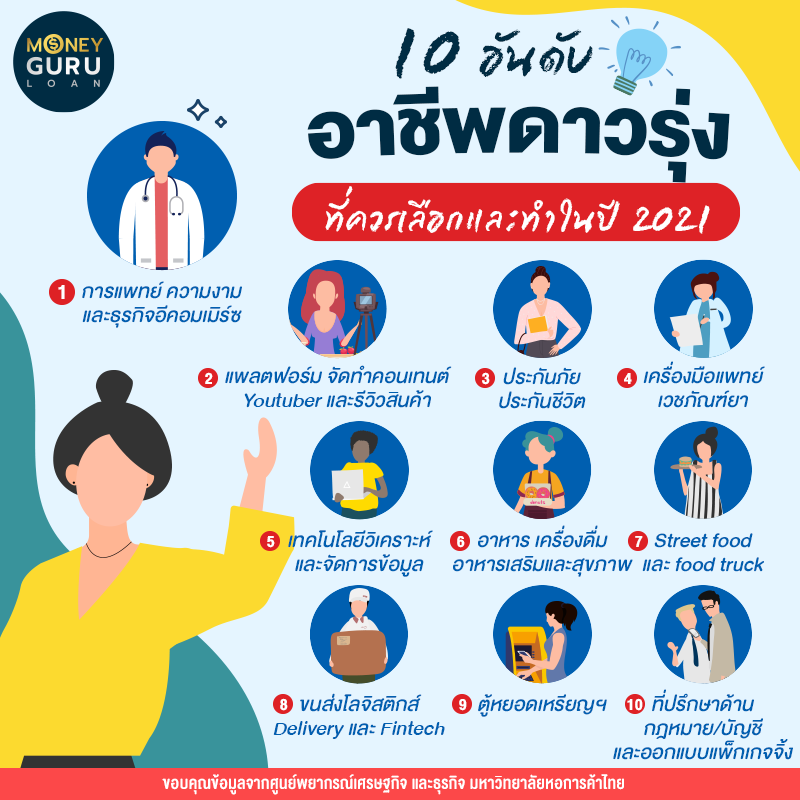 10 อันดับอาชีพดาวรุ่ง ที่ควรเลือกและทำในปี 2021 ผลพวงจากโควิด-19 ส่งผลทำให้การทำงานในบางอาชีพได้รับความนิยมและจำเป็นสำหรับการดำรงชีวิตในช่วงนี้มากขึ้นแบบก้าวกระโดด ซึ่งข้อมูลการจัดอันดับนี้ได้มาจากศูนย์พยากรณ์เศรษฐกิจและธุรกิจ มหาวิทยาลัยหอการค้าไทย โดยอิงมาจากเกณฑ์การให้คะแนนใน 5 ส่วน ประกอบด้วย ยอดขาย, ต้นทุน, กำไรสุทธิ, ผลกระทบจากปัจจัยเสี่ยงและภาวะการแข่งขัน และความต้องการ ความสอดคล้องกับกระแสนิยม โดยมี 10 อาชีพดาวรุ่งในปี 2021 ดังนี้