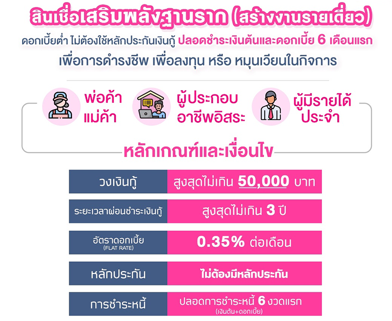 สินเชื่อดอกเบี้ยต่ำ ไม่ต้องใช้หลักประกันเงินกู้ ปลอดชำระเงินต้นและดอกเบี้ย 6 เดือนแรก เพื่อการดำรงชีพ เพื่อลงทุนหรือหมุนเวียนในกิจการ