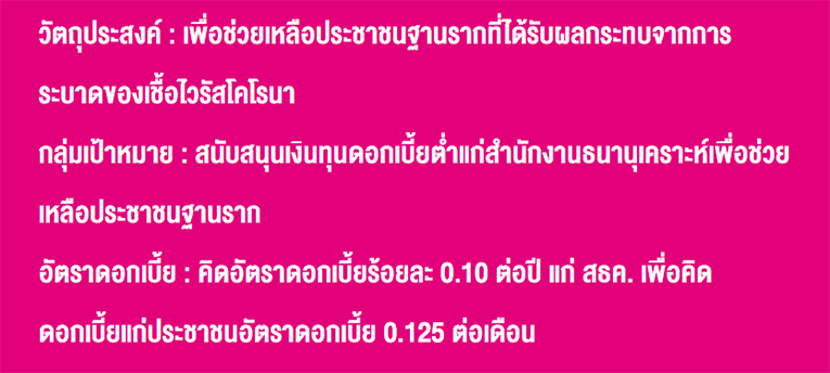 โครงการสินเชื่อดอกเบี้ยต่ำ (Soft Loan) สำหรับสำนักงานธนานุเคราะห์ เพื่อช่วยเหลือประชาชนฐานรากที่ได้รับผลกระทบทั้งทางตรงและทางอ้อมจากการระบาดของไวรัสโควิด-19