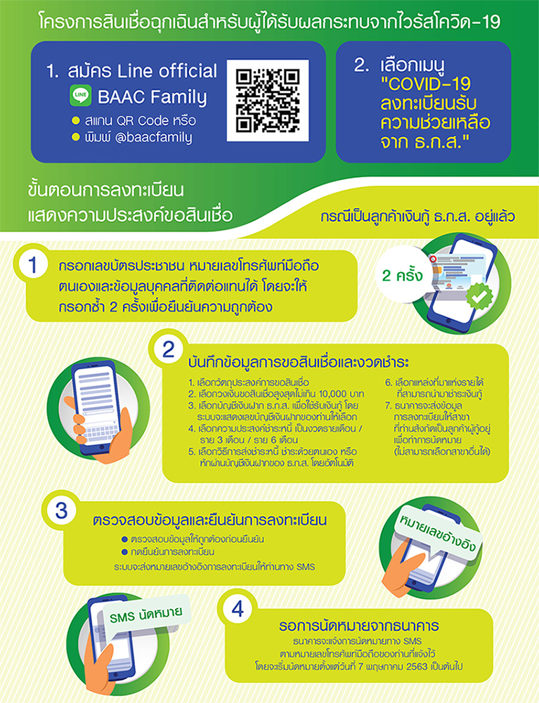 โครงการสินเชื่อฉุกเฉินสำหรับผู้ได้รับผลกระทบจากไวรัสโควิด-19 จาก ธ.ก.ส. แบ่งให้ลูกค้าเป็น 2 กรณี คือ กรณีเป็นลูกค้าเงินกู้ ธ.ก.ส. อยู่แล้ว และกรณีที่ยังไม่ได้เป็นลูกค้าเงินกู้ ธ.ก.ส. มีรายละเอียดดังนี้