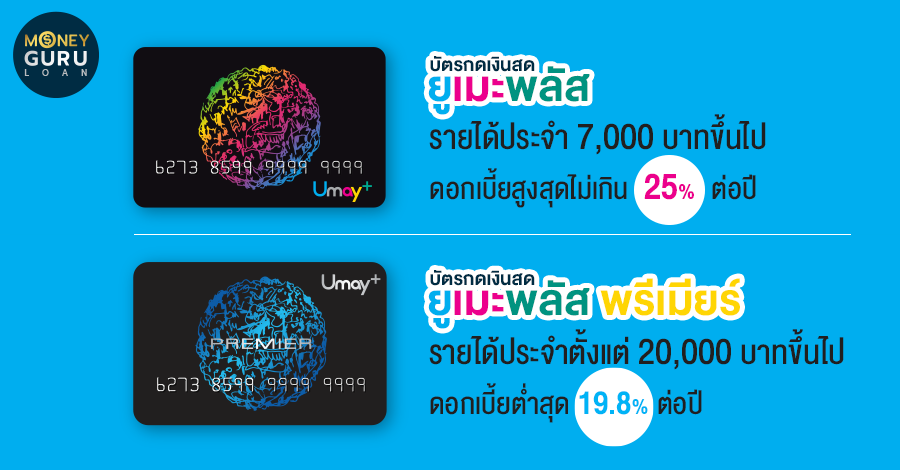 1) บัตรกดเงินสดยูเมะพลัส...เหมาะสำหรับพนักงานผู้มีรายได้ประจำตั้งแต่ 7,000 บาทขึ้นไป อัตราดอกเบี้ยและค่าธรรมเนียมการใช้วงเงินสูงสุดไม่เกิน 25% ต่อปี