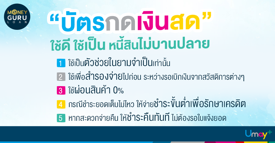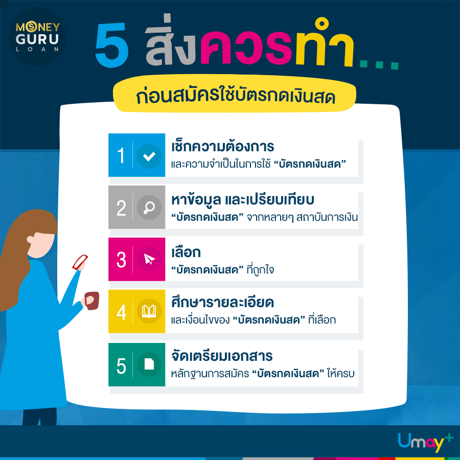 เช็กก่อนใช้ คิดก่อนตัดสินใจ! "บัตรกดเงินสด" ก็คือ "หนี้" ซึ่งหนี้แต่ละประเภทที่มีในปัจจุบันก็มีทั้งหนี้ดี และหนี้พึงระวัง โดยบัตรกดเงินสดนั้นจัดเป็นหนี้ประเภท "หนี้พึงระวัง" เพราะบัตรกดเงินสดเป็นหนี้ที่เกิดขึ้นเพื่อการอุปโภคบริโภค ซื้อของ หรือใช้ในการดำรงชีวิตประจำวัน ดังนั้น ก่อนที่เราจะมีหรือใช้บัตรกดเงินสดเราก็ควรที่จะต้องมีการเช็ก และคิดก่อนใช้เสมอเพื่อให้หนี้ที่จะเกิดขึ้นนี้ได้ประโยชน์มากที่สุด ด้วยการเช็กลิสต์ 5 สิ่งควรทำ...ก่อนสมัครใช้บัตรกดเงินสด ดังนี้ค่ะ