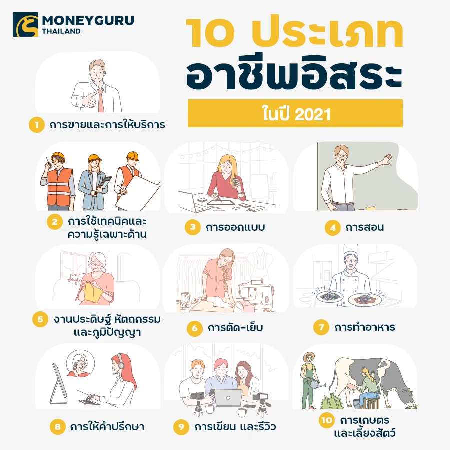 10 ประเภทอาชีพอิสระปี 2021 อาชีพอิสระที่กรมการจัดหางานได้รวบรวมไว้ในปี 2021 นี้ จะประกอบด้วยกันทั้งหมด 10 ประเภทอาชีพอิสระ ซึ่งได้แก่