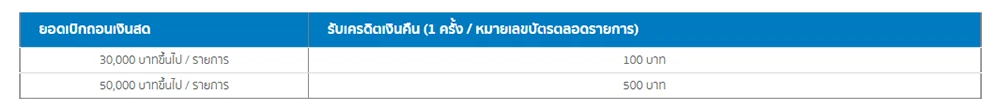 - ไม่มีค่าเบิกถอนล่วงหน้า 3% จะไม่มีการคิดค่าธรรมเนียมเบิกถอนเงินสดล่วงหน้า 3% และไม่เก็บภาษีมูลค่าเพิ่ม 7% เหมือนกับการกดกับบัตรเครดิตทั่วไป
