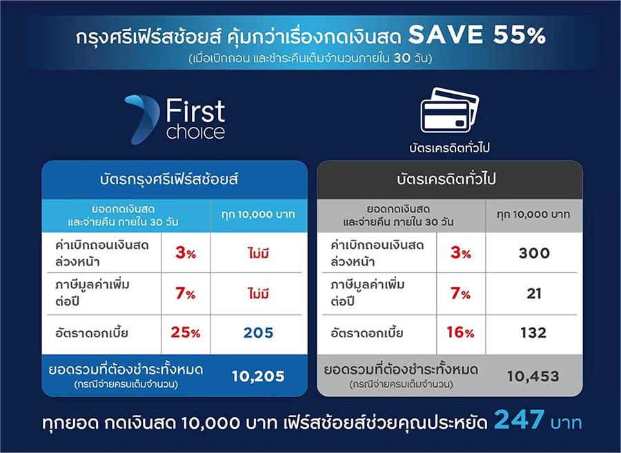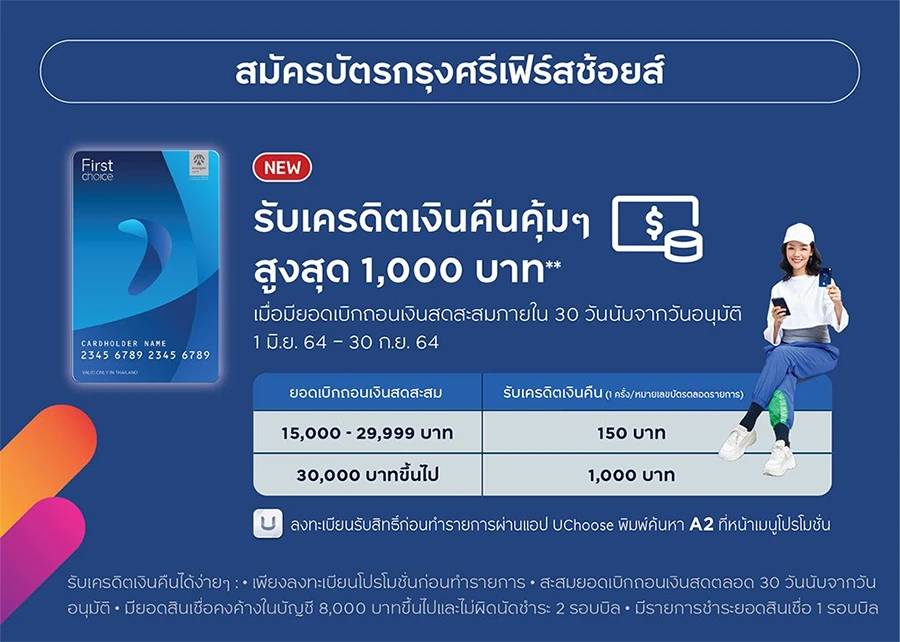 สมัครบัตรกรุงศรีเฟิร์สช้อยส์วันนี้ รับเครดิตเงินคืนคุ้มๆ แบบจุกๆ สูงสุดถึง 1,000 บาท เมื่อมียอดเบิกถอนเงินสดสะสม ภายใน 30 วันนับจากวันอนุมัติ
