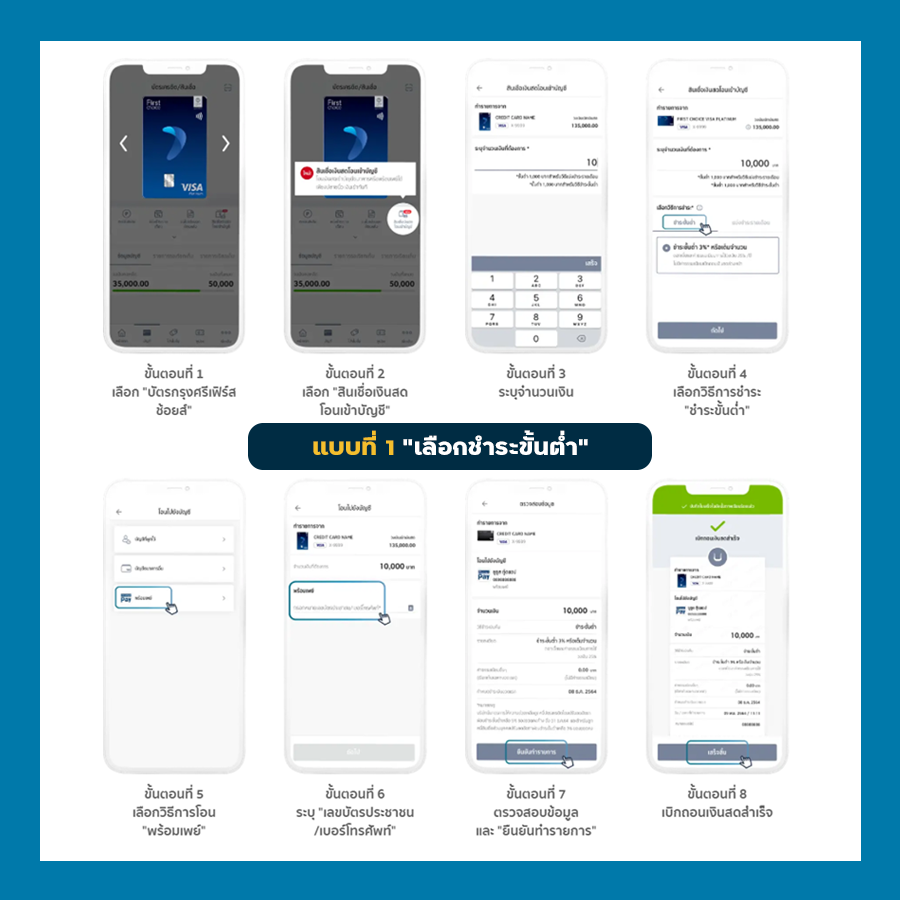 แบบที่ 1 แบบชำระขั้นต่ำ : ชำระคืนขั้นต่ำสบายๆ ยิ่งจ่ายคืนมากสินเชื่อก็หมดเร็วขึ้น หรือถ้าจ่ายคืนน้อย ก็จะทำให้บริหารค่าใช้จ่ายได้ง่ายขึ้น (โดยชำระคืนไม่ต่ำกว่าอัตราผ่อนชำระขั้นต่ำตามที่บริษัทฯ กำหนด)