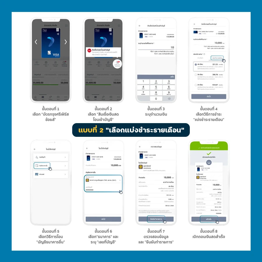 แบบที่ 2 แบบชำระรายเดือน : ทำให้สามารถวางแผนการใช้เงินง่ายขึ้น แบ่งจ่ายได้เท่ากันทุกเดือน สำหรับสินเชื่อส่วนบุคคลสามารถเลือกระยะเวลาแบ่งชำระได้นานสูงสุดถึง 60 เดือน (จำนวนเดือนขึ้นกับยอดสินเชื่อเงินสด)