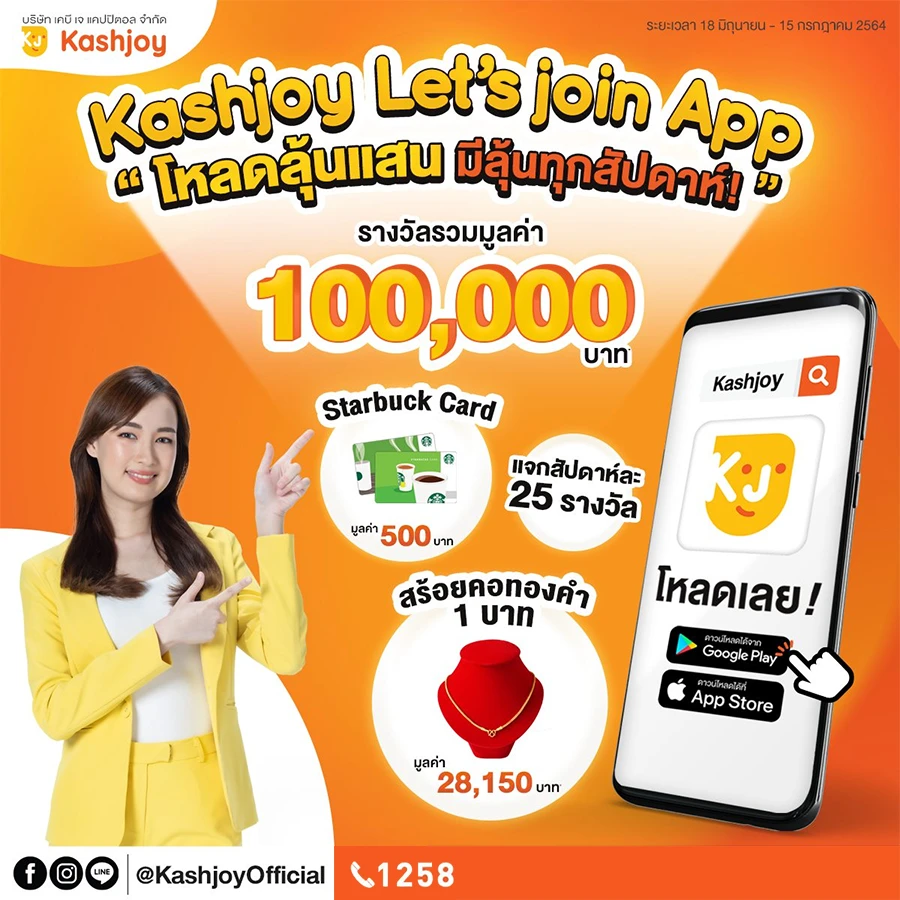 Kashjoy เป็นสินเชื่อยุคดิจิทัล ยกระดับการใช้บริการทางการเงิน ส่งแคมเปญสวนกระแสวิกฤติเศรษฐกิจยุคโควิด-19 แจกรางวัลทุกสัปดาห์ เพียงร่วมสนุกกับ "Kashjoy - Let’s Join App โหลดลุ้นแสน มีลุ้นทุกสัปดาห์" ดาวน์โหลดแอปพลิเคชั่นมือถือ "Kashjoy" (รองรับทั้งระบบ iOS และ Android รับสิทธิ์ลุ้นของรางวัลรวมมูลค่ากว่า 1 แสนบาท อาทิ สร้อยคอทองคำหนัก 1 บาท มูลค่า 28,150 บาท* หรือ บัตร Starbucks มูลค่า 500 บาท จำนวน 100 รางวัลทุกสัปดาห์ ประกาศผลที่หน้าเพจ Facebook: KashjoyOfficial ตั้งแต่วันนี้ - 15 กรกฎาคม 2564