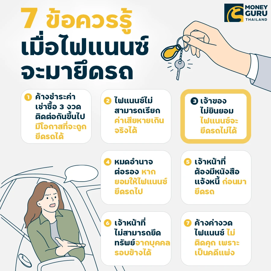 กรณีการถูกยึดรถจะเกิดขึ้นก็ต่อเมื่อมีการค้างชำระค่างวดครบ 3 งวด ซึ่งไฟแนนซ์หรือสถาบันการเงินจะดำเนินการยกเลิกสัญญา และมีจดหมายแจ้งเตือนล่วงหน้าอีก 30 วัน (รวมระยะเวลา 4 เดือน) จึงจะสามารถยึดรถได้ แต่ทั้งนี้การที่ไฟแนนซ์จะมายึดรถจะต้องแสดงหนังสือการมอบอำนาจทุกครั้ง หากลูกหนี้ไม่ยินยอมส่งมอบรถยนต์ ไฟแนนซ์จะมาใช้สิทธิ์บังคับด้วยกำลังหรือการข่มขู่ว่าจะใช้ความรุนแรงในการยึดทรัพย์สินไม่ได้ (พรบ.ทวงถามหนี้มาตรา 11 อนุที่ 1) ดังนั้นผู้เช่าซื้ออย่าเพิ่งยอมให้ไฟแนนซ์ยึดรถไปนะคะ หากเกิดเหตุการณ์ขึ้นเราควรแจ้งเจ้าหน้าที่ตำรวจให้มาเป็นพยานถ้าเราไม่ยินยอมที่จะให้ไฟแนนซ์ยึดรถไป แต่เมื่อไหร่ก็ตามที่เรายอมให้ไฟแนนซ์ยึดรถไปแล้วเราก็จะหมดอำนาจต่อรองทันที และหลังจากยึดรถไปแล้วไฟแนนซ์จะนำรถของเราไปขายทอดตลาดในราคาที่ต่ำกว่าท้องตลาดมาก ซึ่งส่วนใหญ่มักจะไม่พอจ่ายหนี้ที่เราเป็นอยู่ หลังจากนั้นไฟแนนซ์ก็จะดำเนินการเรียกค่าเสียหายด้วยหนังสือแจ้งให้ชำระหนี้ส่วนที่เหลือจากเรา นั่นจะทำให้เราต้องจ่ายหนี้ทั้งๆ ที่ไม่มีรถอยู่แล้ว หรือที่เรียกว่า "รถไม่มีแต่หนี้ยังอยู่" สิ่งที่เราจะทำได้หลังจากนี้ก็คือการหาทนายมาสู้คดี เนื่องจากค่าเสียหายที่ถูกแจ้งให้ชำระจากไฟแนนซ์จะมีมูลค่าสูงมาก (เกินจริง) ซึ่งถ้าตกลงกันได้ส่วนใหญ่ศาลจะพิพากษาให้จ่าย 30% หรือครึ่งหนึ่งของจำนวนยอดทั้งหมดที่ไฟแนนซ์เรียกมา ในกรณีนี้หากเราไม่มีเงินจ่าย เราไม่ต้องติดคุกนะคะ เพราะมันเป็นเพียงคดีแพ่งเท่านั้น และหากเราแพ้คดี ทางไฟแนนซ์จะยึดทรัพย์ได้เฉพาะที่เราถือครองเท่านั้นเพื่อเป็นการชดใช้ค่าเสียหาย แต่ถ้าเราไม่มี ไฟแนนซ์จะไม่สามารถเรียกร้องจากญาติ พี่น้องเราได้ จึงจะไม่มีใครต้องเดือดร้อนเพราะเราแน่นอน