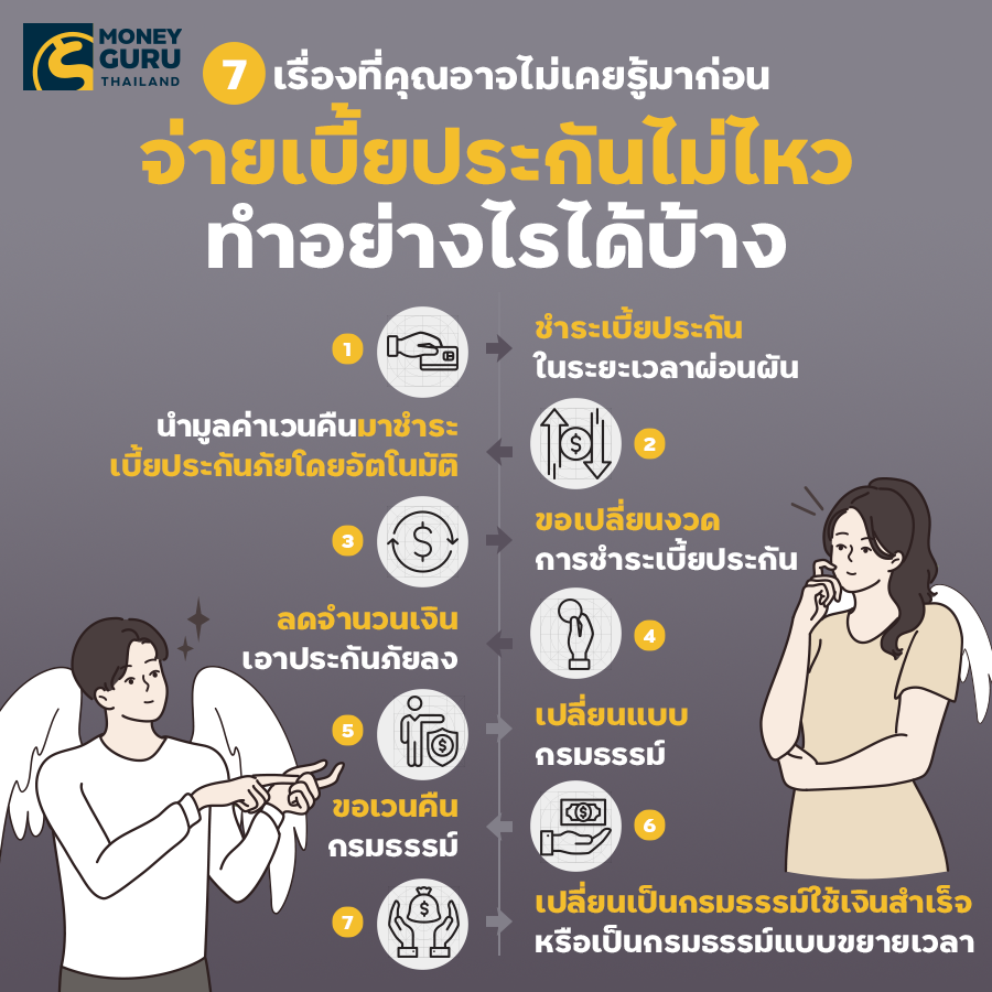 ในระยะหลังๆ มานี้ "การทำประกันชีวิต" เป็นเรื่องที่เราหันมาใส่ใจ และให้ความสำคัญกันมากขึ้น ไม่ว่าจะด้วยสถานการณ์โควิด-19 หรือด้วยเหตุผลที่ไม่อยากตกเป็นภาระของคนข้างหลัง หากเกิดเหตุไม่คาดคิด หรือจะด้วยเหตุผลที่เวลาเจ็บป่วยด้วยโรคภัยต่างๆ เราก็จะมีหลักประกันที่จะทำให้เราเชื่อมั่นได้ว่าเราสามารถเข้ารับการรักษาได้อย่างสบายใจ ซึ่งก็อย่างที่ทราบกันดีว่าค่าเบี้ยประกันภัยของกรมธรรม์แต่ละฉบับก็มากน้อยขึ้นอยู่กับความคุ้มครองที่เราจะได้รับ ตอนทำแรกๆ เราก็ว่าเราจ่ายไหว แต่พอทำไปสักระยะ เกิดภาวะฉุกเฉิน "เงินช็อต" จนทำให้จ่ายไม่ไหว มีหลายคนที่ยอมทิ้งค่าเบี้ยที่เคยจ่ายไปก็มี วันนี้...เราจะพามาดูกับ 7 เรื่องที่คุณอาจไม่เคยรู้ เมื่อจ่ายเบี้ยประกันไม่ไหว เราจะทำอย่างไรได้บ้าง