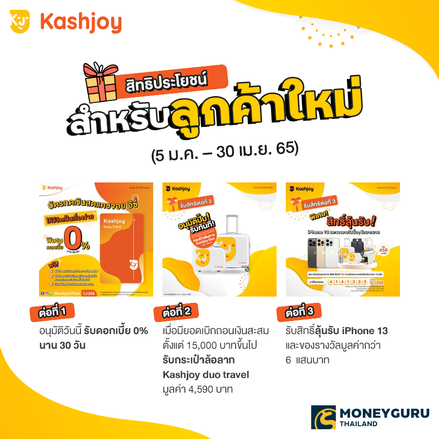 สิ่งที่ได้จาก "บัตรกดเงินสดแคชจอย อีซี่" ก็คือ สิทธิประโยชน์ต่างๆ ซึ่งสิ่งที่หลายคนอยากได้จากการกู้เงินมากที่สุดก็คงหนีไม่พ้น "ดอกเบี้ย 0%" และบัตรกดเงินสดใบนี้ก็มีแน่นอน โดยให้ระยะเวลาดอกเบี้ย 0% นี้ นานถึง 30 วัน (ถ้าบวกลบคูณหาร ก็สามารถประหยัดค่าดอกเบี้ยไปได้เยอะเลยนะคะ) นอกจากนี้ความดีของบัตรกดเงินสดใบนี้ก็ยังไม่หมดนะคะ เพราะทางทีมงานได้หาข้อมูลทั้งหมดมานำเสนอนี้ เนื่องจากดูแล้วว่า ปกติบัตรกดเงินสดโดยทั่วไปก็จะมีคุณสมบัติใกล้เคียงกันหรือเหมือนกัน นั่นก็คือ เป็นสินเชื่อที่มีไว้ใช้ยามฉุกเฉิน ไม่ใช้ก็ไม่เสียดอกเบี้ย และใช้เท่าไหร่ ก็จ่ายเท่านั้น แต่ความแตกต่างของบัตรกดเงินสดแต่ละสถาบันการเงินจะอยู่ที่สิทธิประโยชน์ที่มีให้ ซึ่ง "บัตรกดเงินสดแคชจอย อีซี่" มีให้ทั้งดอกเบี้ย 0% ได้รับของสมนาคุณเป็นกระเป๋าล้อลากที่มีมูลค่าถึง 4,590 บาท และที่น่าสนใจเพิ่มขึ้นด้วยการลุ้นรับสิทธิ์เป็นเจ้าของ iPhone13 หรือของรางวัลอื่นๆ อีกมากมาย ดูๆ แล้วก็เร้าใจดีนะคะ...เห็นแบบนี้แล้ว บอกเลยว่า "คุ้ม" มาดูรายละเอียดชัดๆ กันอีกครั้งค่ะ ดังนี้