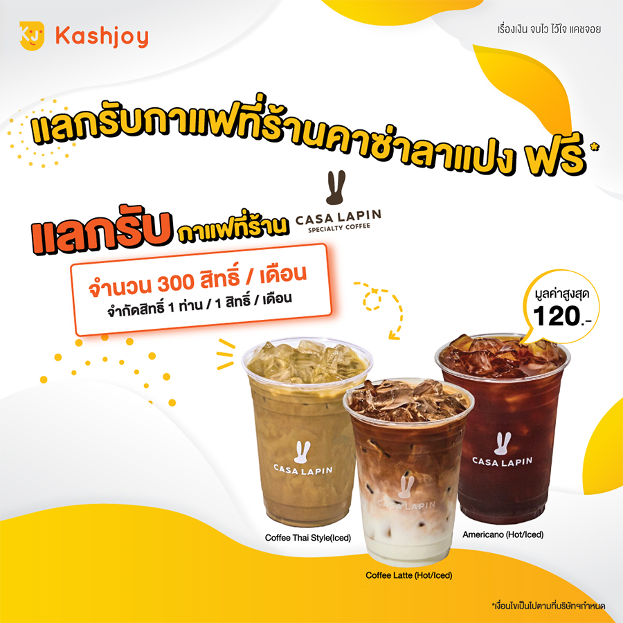 Get Free 1 Drink เพียงแค่โชว์บัตรกดเงินสดแคชจอย อีซี่ รับฟรี! เครื่องดื่ม Americano (Hot/Iced), Coffee Latte (Hot/Iced), Coffee Thai Style (Iced) 1 แก้ว มูลค่าสูงสุด 120 บาท