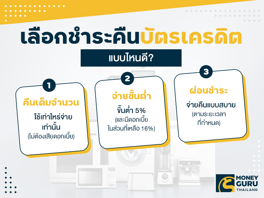 ปัจจุบัน "บัตรเครดิต" ได้เข้ามามีบทบาทในการใช้ชีวิตประจำวันของหลายๆ คน เพราะ "บัตรเครดิต" คือ ผลิตภัณฑ์ทางการเงินที่สถาบันการเงินมีไว้ให้เรายืมเงินมาใช้ก่อน เพื่อจ่ายสินค้าหรือบริการแทนเงินสด ตามวงเงินอนุมัติ ซึ่งการใช้จ่ายแต่ละครั้งเราจะต้องทำการชำระคืนตามแจ้งการเรียกเก็บจากสถาบันการเงินนั้นๆ โดยสามารถเลือกชำระแบบคืนเต็มจำนวน ชำระแบบจ่ายขั้นต่ำ หรือแบบผ่อนชำระก็ได้ (เป็นไปตามเงื่อนไขของสถาบันการเงิน) แต่การเลือกจ่ายในแต่ละแบบนั้นก็จะมีเงื่อนไขของมันเอง ดังนี้