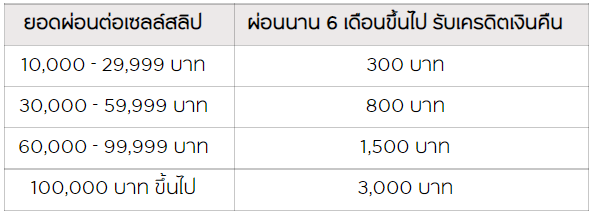 เมื่อมียอดผ่อนชำระ 5,000 บาทขึ้นไปต่อเซลล์สลิป และแลกได้ไม่เกินยอดผ่อนชำระต่อเซลล์สลิป แลกพอยต์สะสมทุกๆ 5,000 พอยต์ รับเครดิตเงินคืน 750 บาท