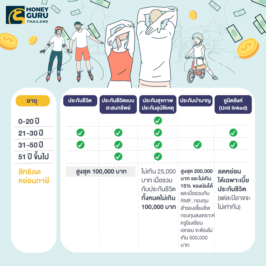 กำลังสร้างเนื้อสร้างตัว เป็นเสาหลักของบ้าน แนะนำให้ทำประกันชีวิตเอาไว้ ในกรณีที่มีเรื่องไม่คาดฝัน เงินทุนประกันสามารถส่งมอบต่อเป็นมรดกให้กับคนที่เรารักได้ค่ะ ส่วนใหญ่ประกันชีวิตจะมีระยะเวลาจ่ายเบี้ยประกันที่ 20 ปี แต่ให้ความคุ้มครองยาวถึงอายุ 90-99 ปีกันเลย ถือว่าเป็นการทำประกันระยะยาวเพื่อความมั่นคงของครอบครัว อีกเรื่องคือสุขภาพ ก็จำเป็นต้องใส่ใจเป็นพิเศษ เพราะอยู่ในวัยเสี่ยงที่จะเกิดโรคร้ายแรง อาจจะทำเพิ่มในส่วนประกันสุขภาพเหมาจ่าย ประกันชดเชยรายได้ และโรคร้ายแรงเพิ่มเติม ซึ่งหลายๆ คนมักเริ่มทำประกันสุขภาพตอนเริ่มมีอายุแล้ว และตอนอายุยังไม่เยอะก็ทำแค่ประกันชีวิตเพื่อลดภาษีไว้ก่อน ซึ่งจริงๆ ก็ไม่ผิด แต่การทำประกันสุขภาพตอนอายุมากแล้ว จะมีข้อสังเกตเพิ่มเติม เช่น ค่าเบี้ยแพง โรคบางโรคอาจเริ่มไม่ครอบคลุม เพราะตัวเองมีประวัติสุขภาพ เป็นต้นค่ะ