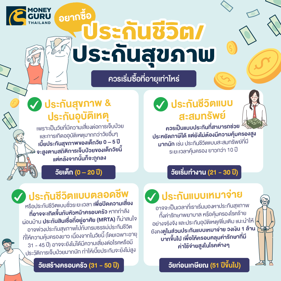 คำถามธรรมดาๆ ที่หลายคนก็ไม่รู้จะเริ่มต้นอย่างไร ยังมีคำถามในใจว่า เราจำเป็นต้องทำประกันสุขภาพหรือประกันชีวิตด้วยหรอ หรือทำไปทำไม มีประโยชน์อะไร ทั้งนี้อาจจะเพราะไม่มีความรู้ด้านประกัน ไม่เข้าใจประโยชน์ที่แท้จริง หรือไม่แน่ใจว่าควรเริ่มจากตรงไหนดี วันนี้อยากลองแบ่งประเภทประกันชีวิตให้เหมาะตามช่วงอายุ ให้ทุกคนเห็นภาพมากขึ้น เพื่อใช้ประกอบการตัดสินใจนะคะ