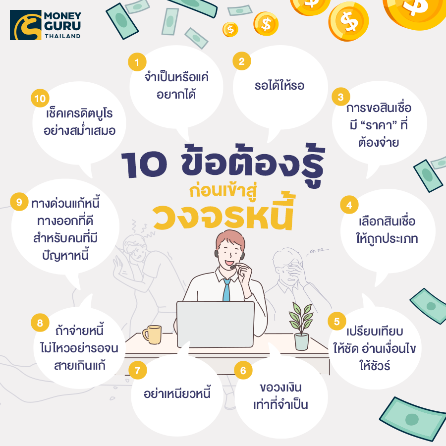 สำหรับใครที่กำลังตัดสินใจที่จะก้าวเท้าเข้าสู่ "วงจรหนี้" หันกลับมาทบทวนดูอีกครั้งถึงความจำเป็นในการก่อหนี้ก้อนนี้ และเตรียมแนวทางแก้ไขหากเกิดปัญหาไม่คาดคิด เช่น เมื่อถึงวันที่เราจ่ายหนี้ไม่ไหว เราต้องทำอย่างไร เป็นต้น กับ "10 ข้อต้องรู้ก่อนเข้าสู่วงจรหนี้" กันสักนิดนะคะ