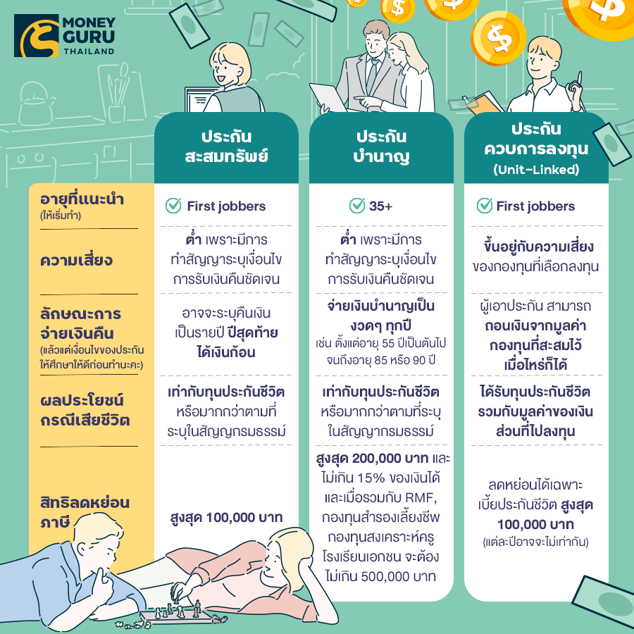 เป็นประกันที่เป็นที่นิยมทำกันเพื่อเก็บเงินเป็นหลัก คล้ายกับการฝากเงินกับธนาคาร แต่มีความคุ้มครองชีวิตให้แถมมาด้วย มีระยะเวลาความคุ้มครอง ทั้งสั้น และยาว ให้เลือกทำได้ตามความต้องการ เช่น 10 ปี 15 ปี 20 ปี 25 ปี ซึ่งถ้าเราทำตอนอายุยังน้อยๆ และวางไว้เป็นเงินก้อนเกษียณ อาจจะลองดูแบบประกันที่มีระยะคุ้มครองยาวหน่อย เช่น 25 ปี แต่ถ้าทำตอนวัยกลางคนแล้ว ลองเลือกแบบที่มีระยะที่สั้นลงได้ค่ะ